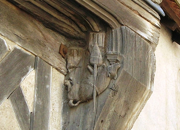 Accolée à la «maison du saumon», la maison de «la truie qui file» présente une sculpture en bois illustrant une fable moralisatrice qui recommande de ne pas forcer le naturel et de faire ce qui convient à notre personnalité. |